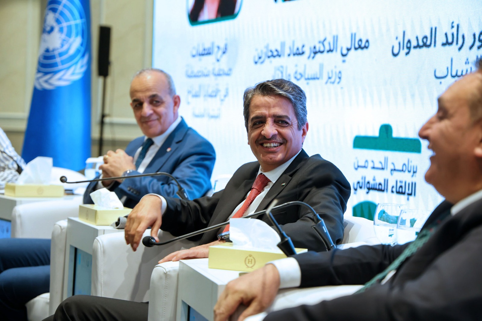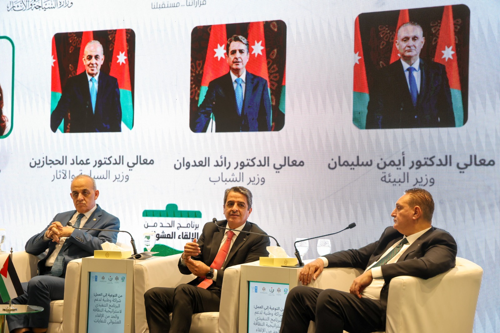 رعى وزير الشباب الدكتور رائد سامي العدوان، اليوم الأحد، فعاليات اللقاء الحواري بعنوان "من التوعية إلى العمل: شراكة وطنية لدعم البرنامج التنفيذي لاستراتيجية النظافة والحد من الإلقاء العشوائي للنفايات"، والذي نظمته وزارة البيئة بالتعاون ودعم من برنامج الأمم المتحدة الإنمائي في مدينة الحسين للشباب، بمشاركة وزير البيئة د.أيمن سليمان، ووزير السياحة والآثار د.عماد حجازين، والممثلة المقيمة لبرنامج الأمم المتحدة الإنمائي في الأردن رندة أبو الحُسن، وبحضور أمين عام وزارة الشباب د.مازن أبو بقر، وأمين عام وزارة البيئة د.عمر عربيات، وعدد من الشباب والشابات من أعضاء المراكز الشبابية والناشطين في المجال البيئي.