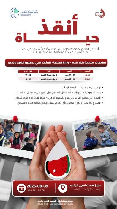 مستشفى الرشيد يطلق حملة للتبرع بالدم لأهلنا في قطاع غزة.