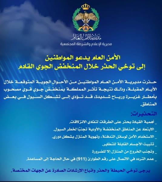الأمن العام يدعو المواطنين إلى توخي الحذر خلال المنخفض الجوي القادم