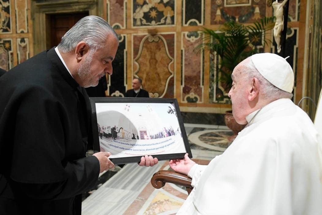 الأب رفعت بدر يقدم لوحة لكنيسة المغطس للبابا فرنسيس ويخبره عن معرض الأردن الوشيك في الفاتيكان