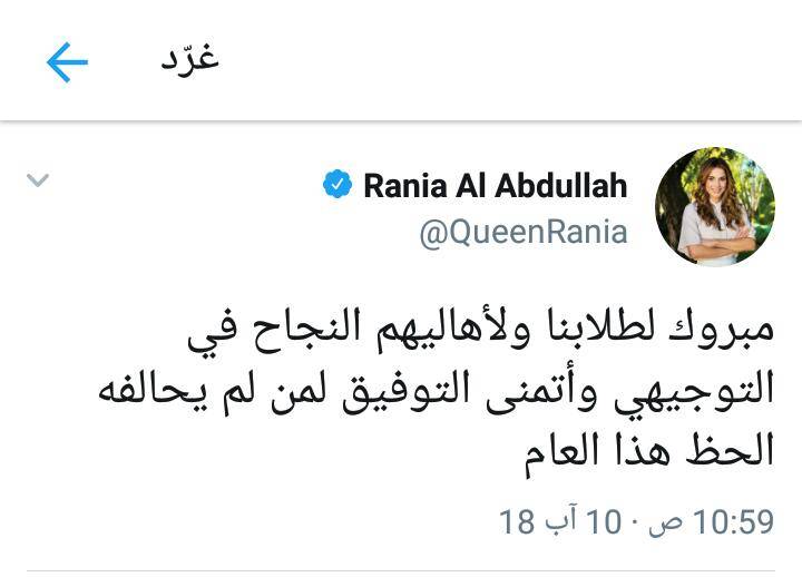 الملكة رانيا عبر تويتر: مبروك لطلابنا ولأهاليهم النجاح في التوجيهي وأتمنى التوفيق لمن لم يحالفه الحظ هذا العام.