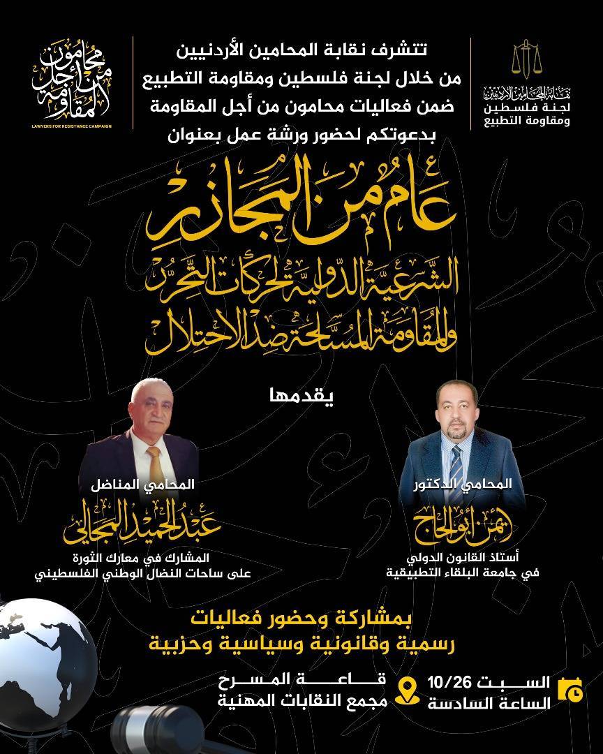 "ورشة بعنوان" الشرعية الدولية للمقومة السبت بمجمع النقابات