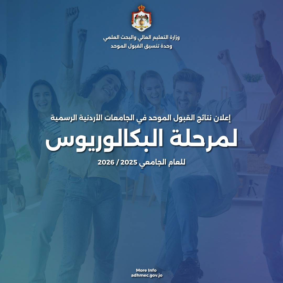 وحدة تنسيق القبول الموحد تعلن عن نتائج القبول الموحد في الجامعات الأردنية الرسمية لمرحلة البكالوريوس للعام الجامعي 2025-2026