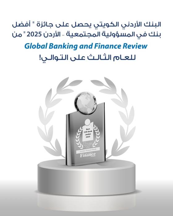 البنك الإسلامي الأردني يحصد جائزة "الريادة والتميز بتعزيز الشمول المالي من خلال التمويل الإسلامي في الأردن لعام 2025"